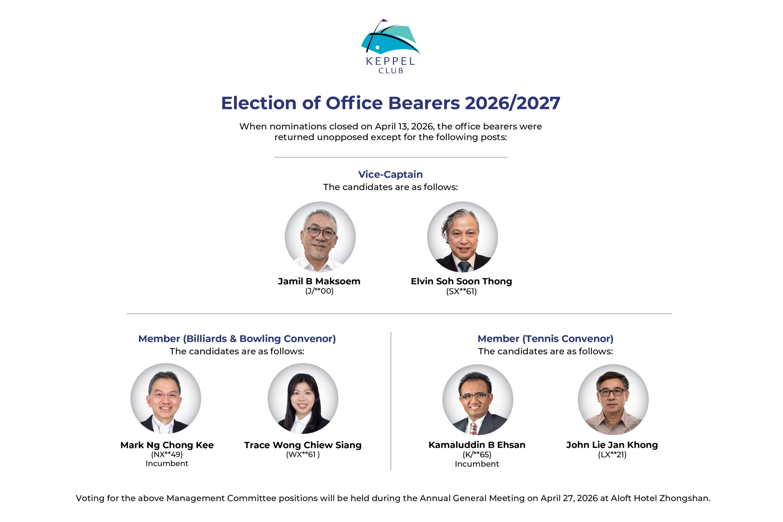 Management extends its sincere appreciation to Mr Wong Kok Leong for his dedicated service as Vice-Captain over the past years. We thank all nominees and wish them the very best in the upcoming election.